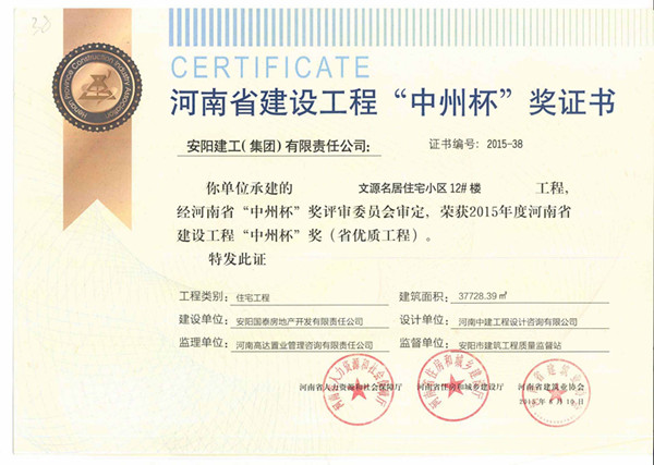 我單位承建的“文源名居住宅小區(qū)12#樓”榮獲2015年度河南省建設(shè)工程“中州杯”獎(jiǎng)