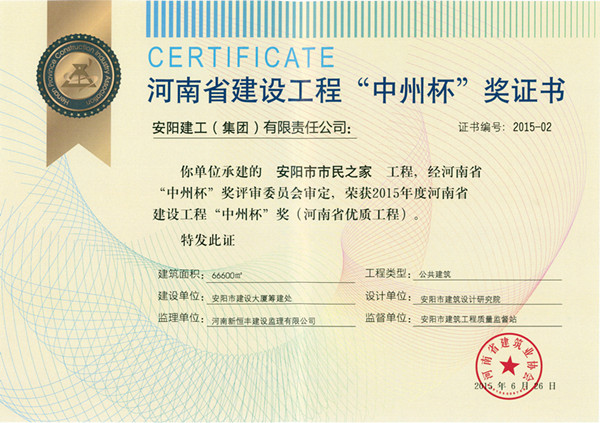 我單位承建的“安陽市市民之家”工程榮獲2015年度河南省建設(shè)工程“中州杯“獎”