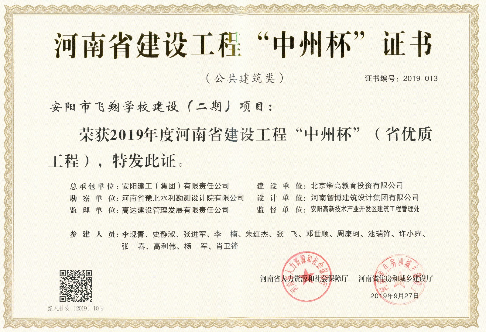 我公司承建的安陽(yáng)市飛翔學(xué)校二期項(xiàng)目榮獲2019年度河南省建設(shè)工程中州杯獎(jiǎng)
