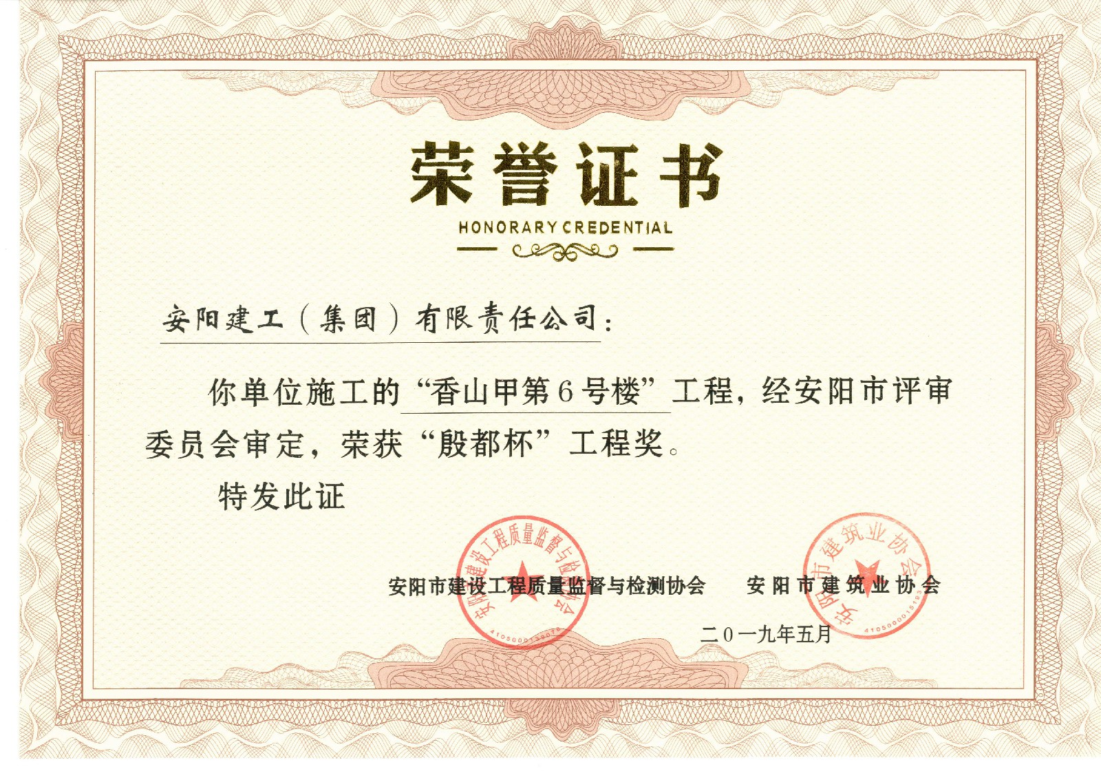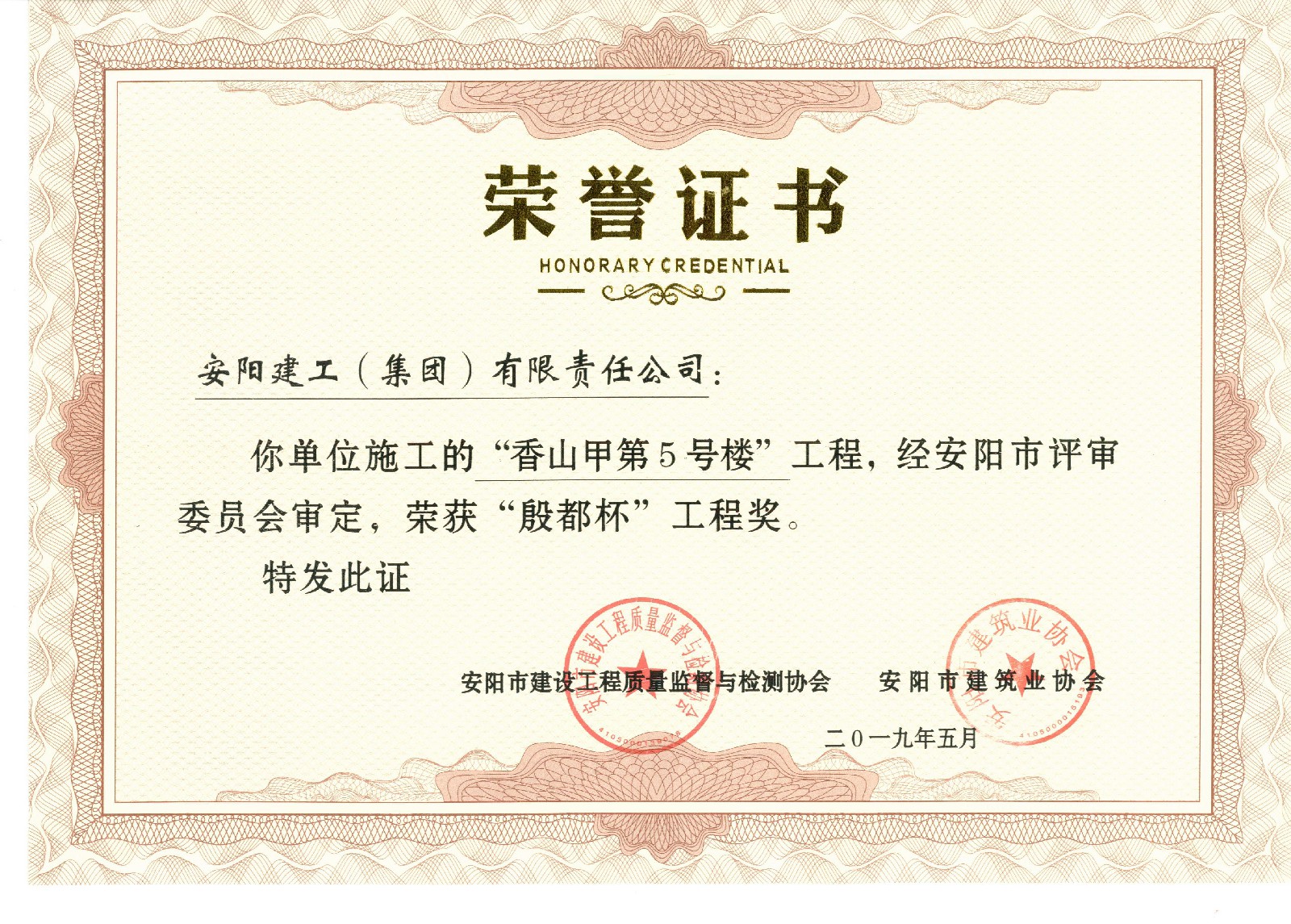 我公司承建的安陽(yáng)市香山甲第5#6#樓項(xiàng)目榮獲2019年度安陽(yáng)市殷都杯工程獎(jiǎng)