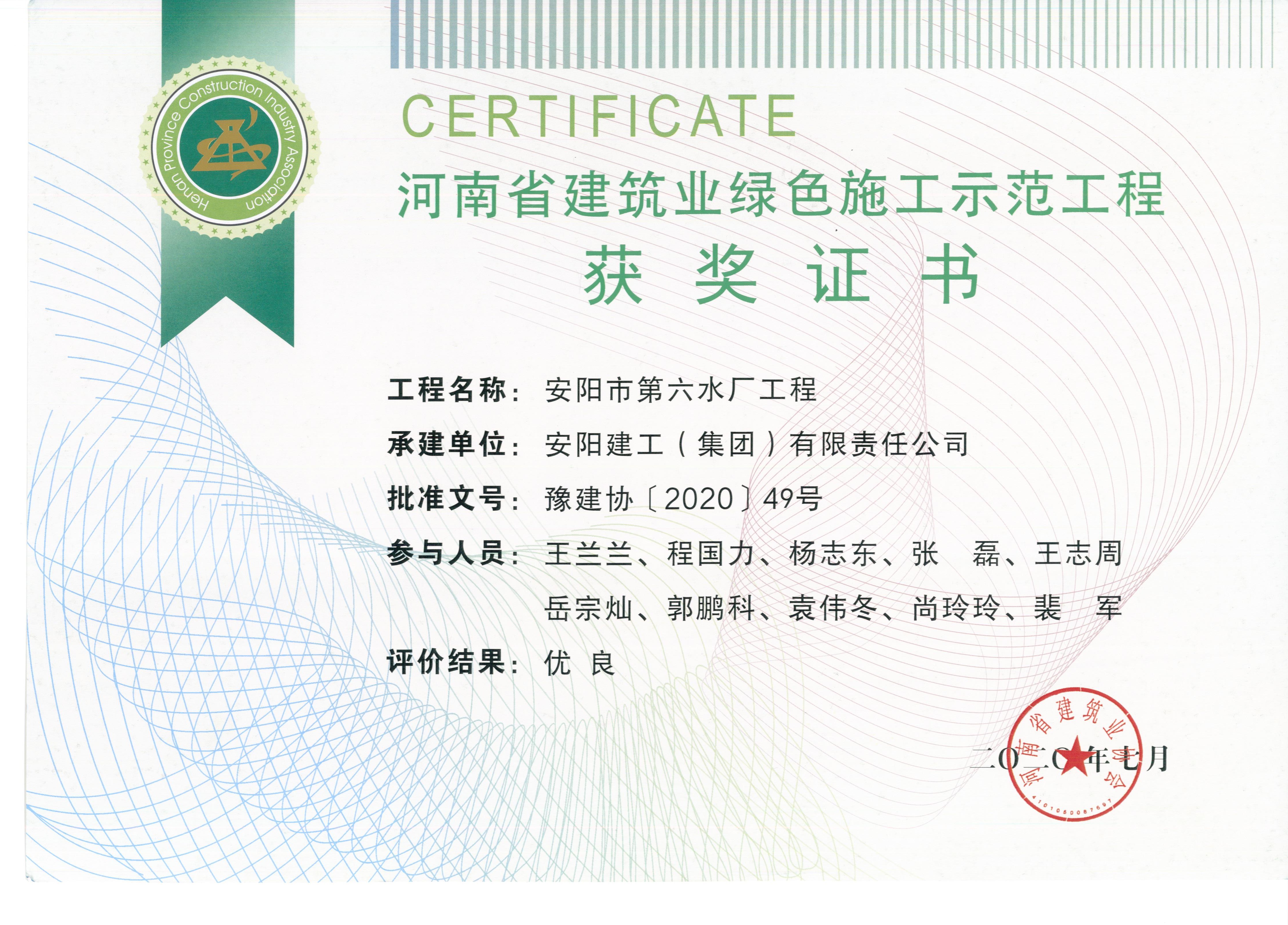 我公司安陽市第六水廠工程項目榮獲2020年河南省建筑業(yè)綠色施工示范工程
