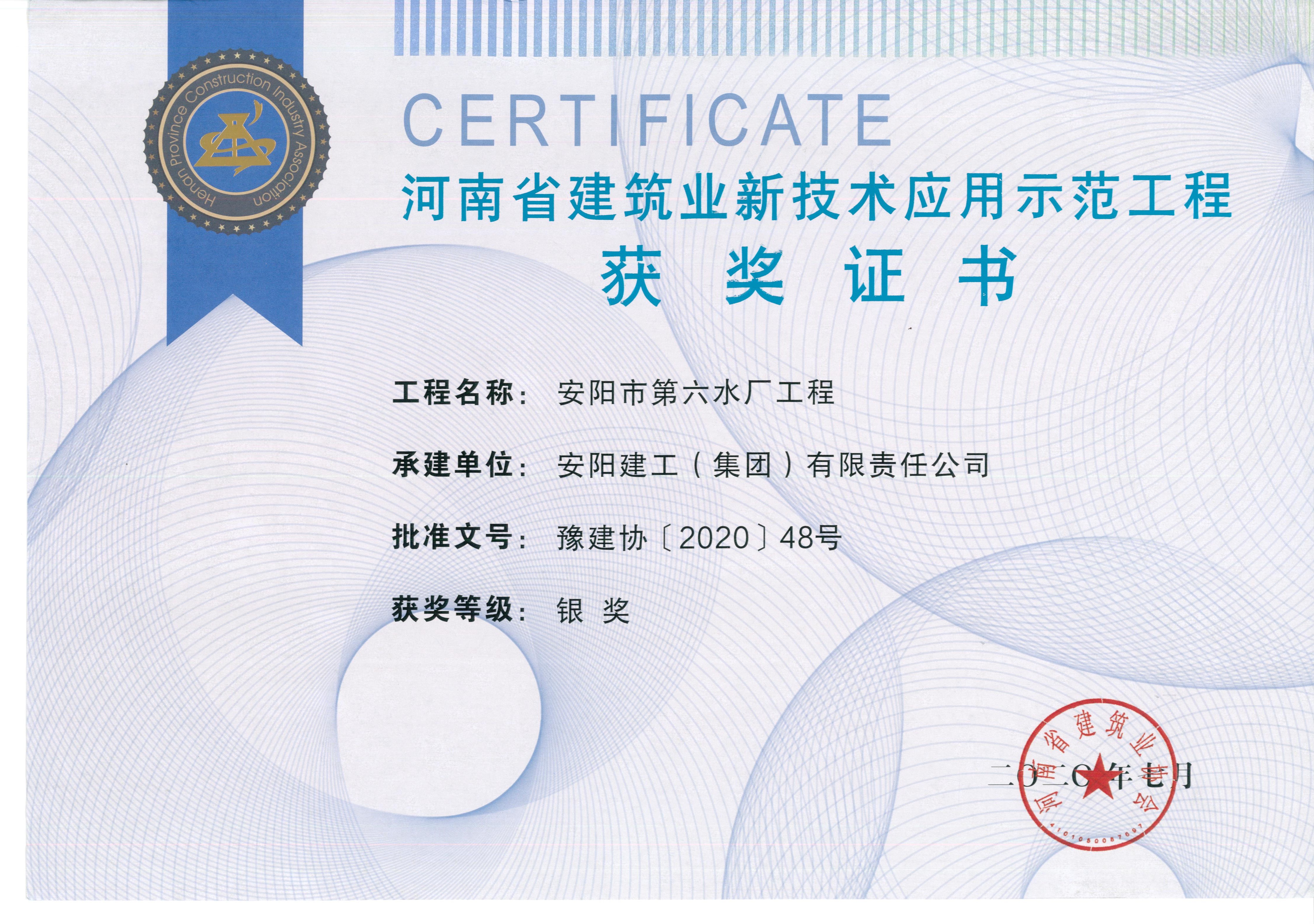 我公司安陽市第六水廠工程項(xiàng)目榮獲2020年河南省建筑業(yè)新技術(shù)應(yīng)用示范工程