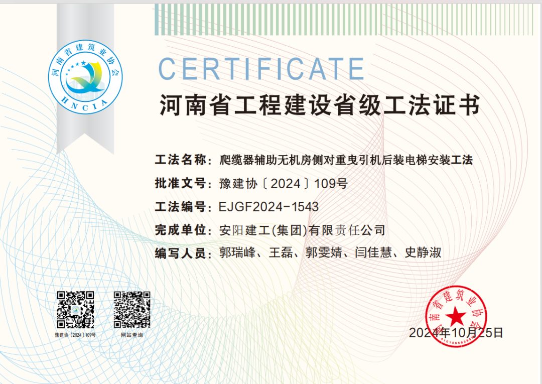 近日,集團(tuán)公司技術(shù)創(chuàng)新成果再創(chuàng)佳績(jī)。公司申報(bào)的《爬纜器輔助無(wú)機(jī)房側(cè)對(duì)重曳引機(jī)后裝電梯安裝工法》順利通過(guò)省協(xié)會(huì)專家評(píng)審,榮獲2024年“河南省省級(jí)工法”。
